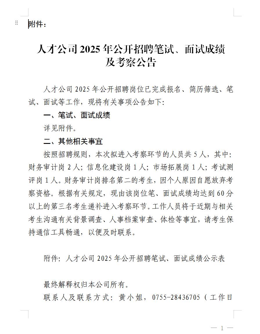 人才公司2025年公开招聘岗位已完成报名、简历筛选、笔试、面试等工作,现将有关事项公告如下:一、笔试、面试成绩 详见附件。二、其他相关事宜按照招聘规则,本次拟进入考察环节的人员共5人,其中:财务审计岗2人;信息化建设岗1人;市场拓展岗1人;考试测评岗1人。财务审计岗排名第二的考生,因个人原因自愿放弃考察资格。根据有关规定,现由该岗位笔、面试成绩均达到6