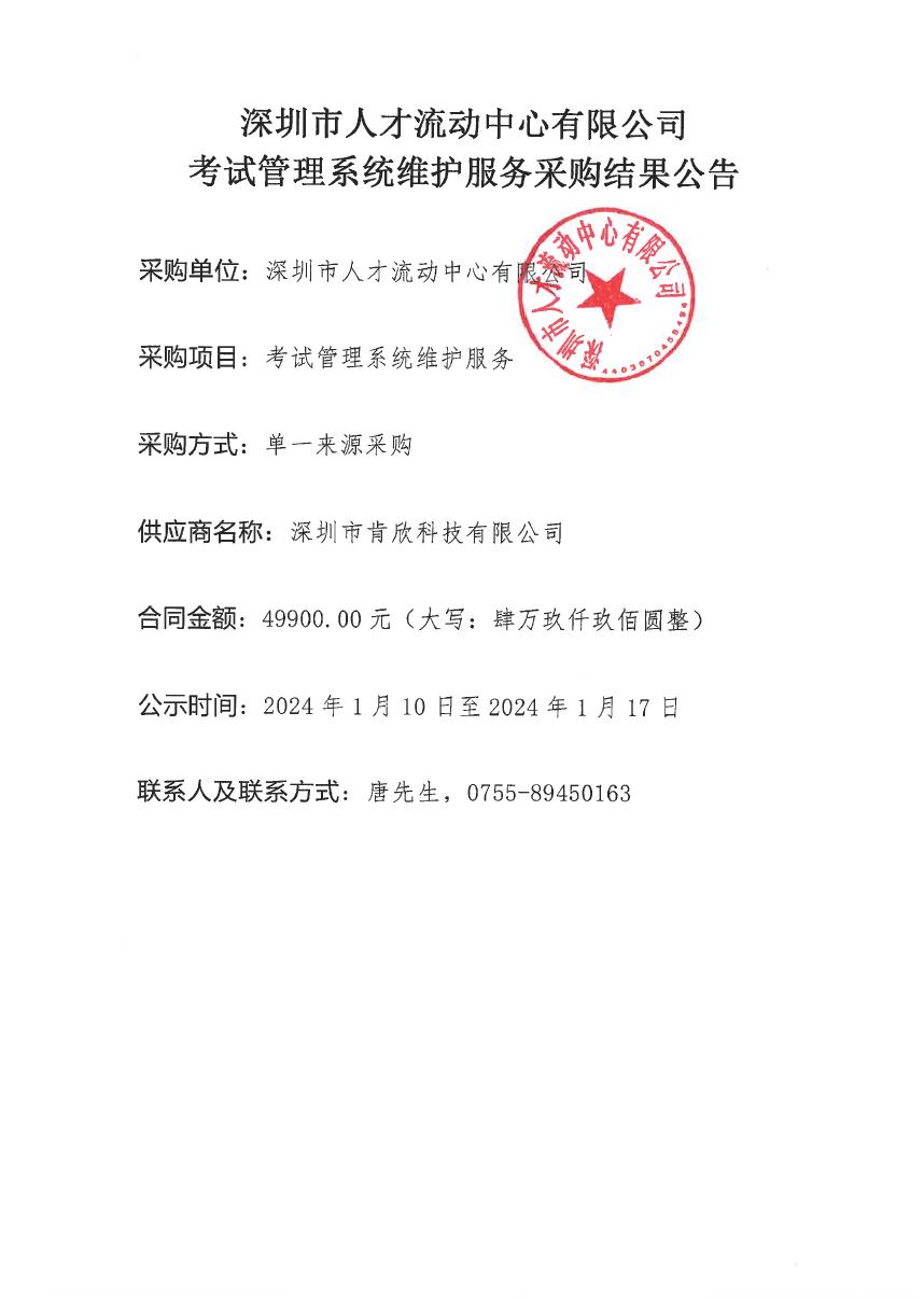 深圳市人才流动中心有限公司-考试管理系统维护服务采购结果公告