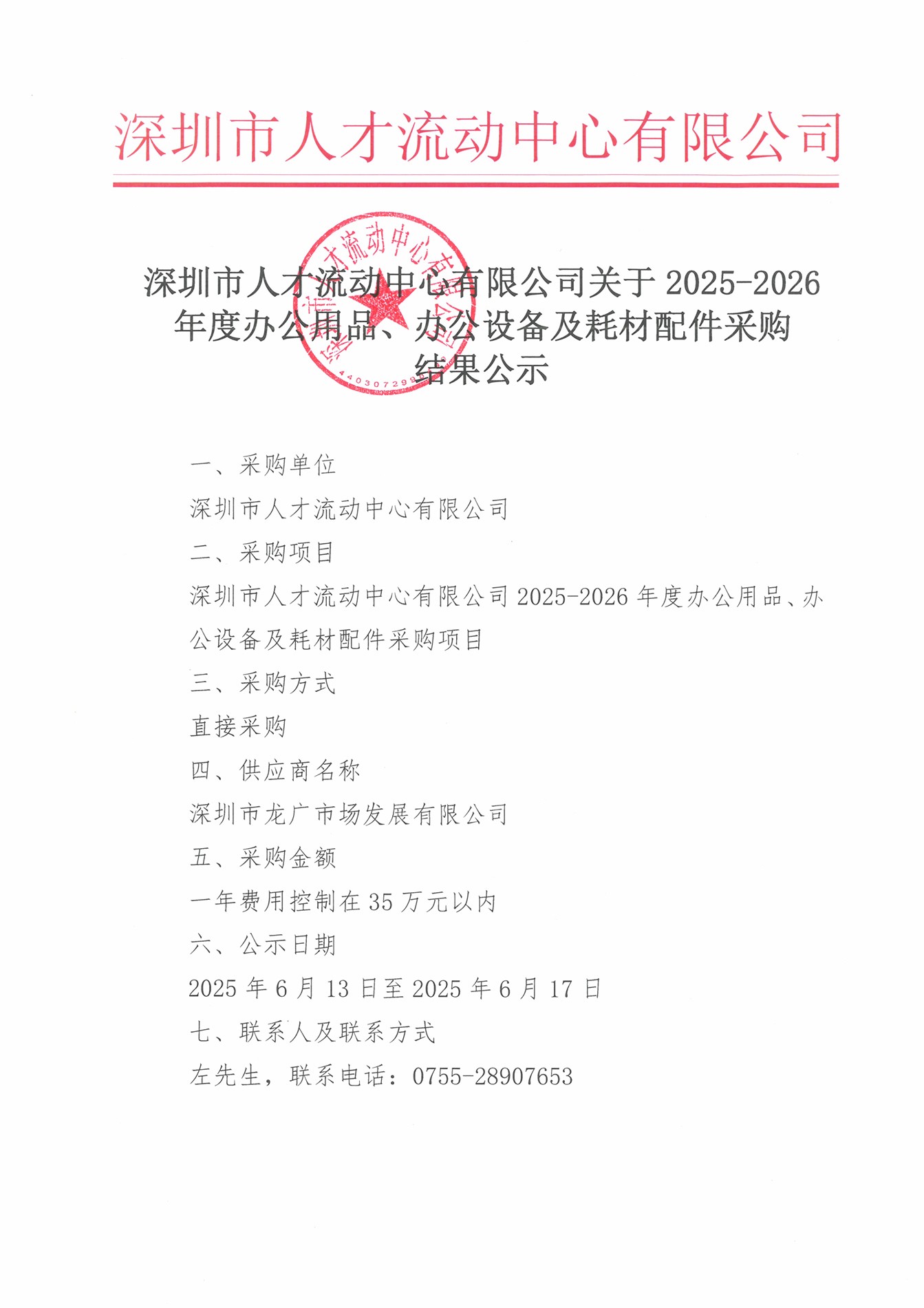 深圳市人才流动中心有限公司关于2025-2026年度办公用品、办公设备及耗材配件采购 结果公示