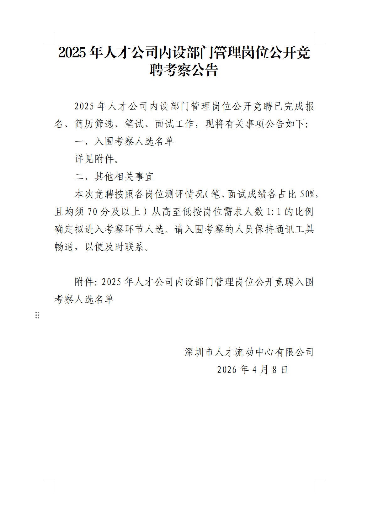 2025年人才公司内设部门管理岗位公开竞聘已完成报名、简历筛选、笔试、面试工作,现将有关事项公告如下:一、入围考察人选名单详见附件。二、其他相关事宜本次竞聘按照各岗位测评情况(笔、面试成绩各占比50%,且均须70分及以上)从高至低按岗位需求人数1:1的比例确定拟进入考察环节人选。请入围考察的人员保持通讯工具畅通,以便及时联系。 附件:2025年人才公司内设部门管理岗位公开竞聘入围考察人选