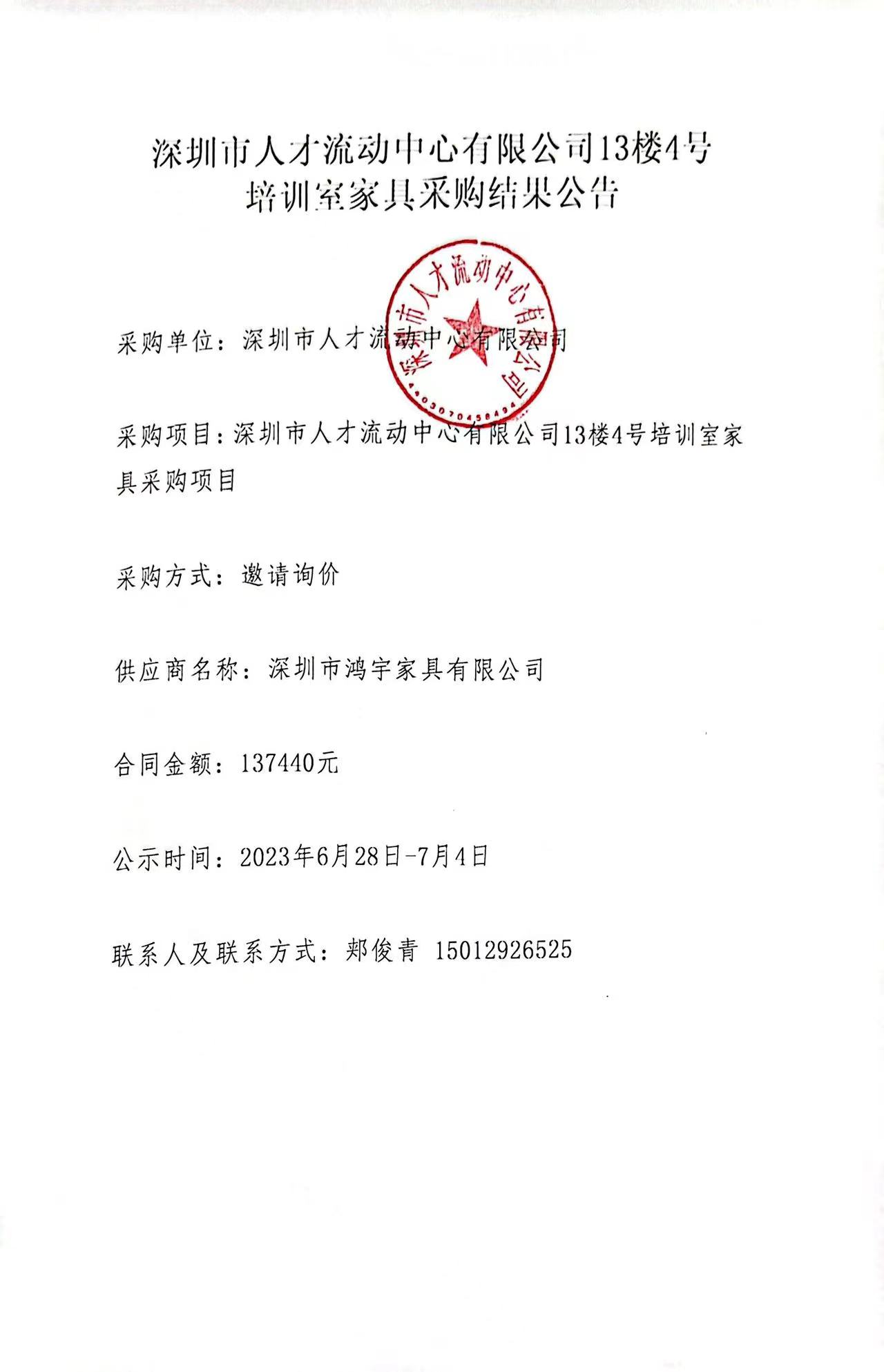 深圳市人才流动中心有限公司13楼4号培训室家具采购结果公告