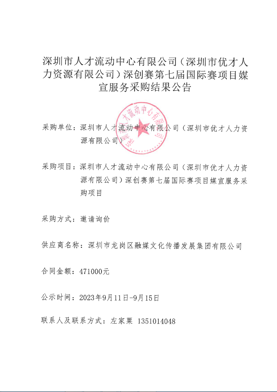 深圳市人才流动中心有限公司(深圳市优才人力资源有限公司)深创赛第七届国际赛项目媒宣服务采购结果公告