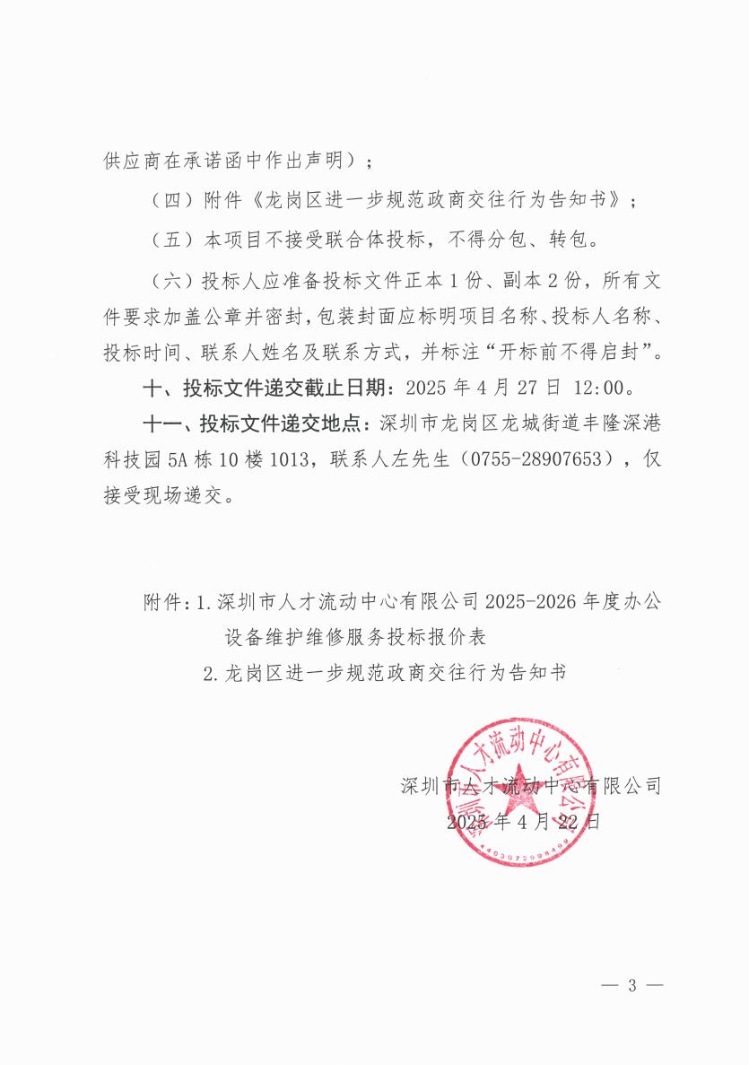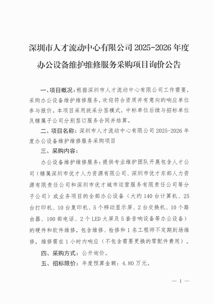 深圳市人才流动中心有限公司2025-2026年度办公设备维护维修服务采购项目询价公告