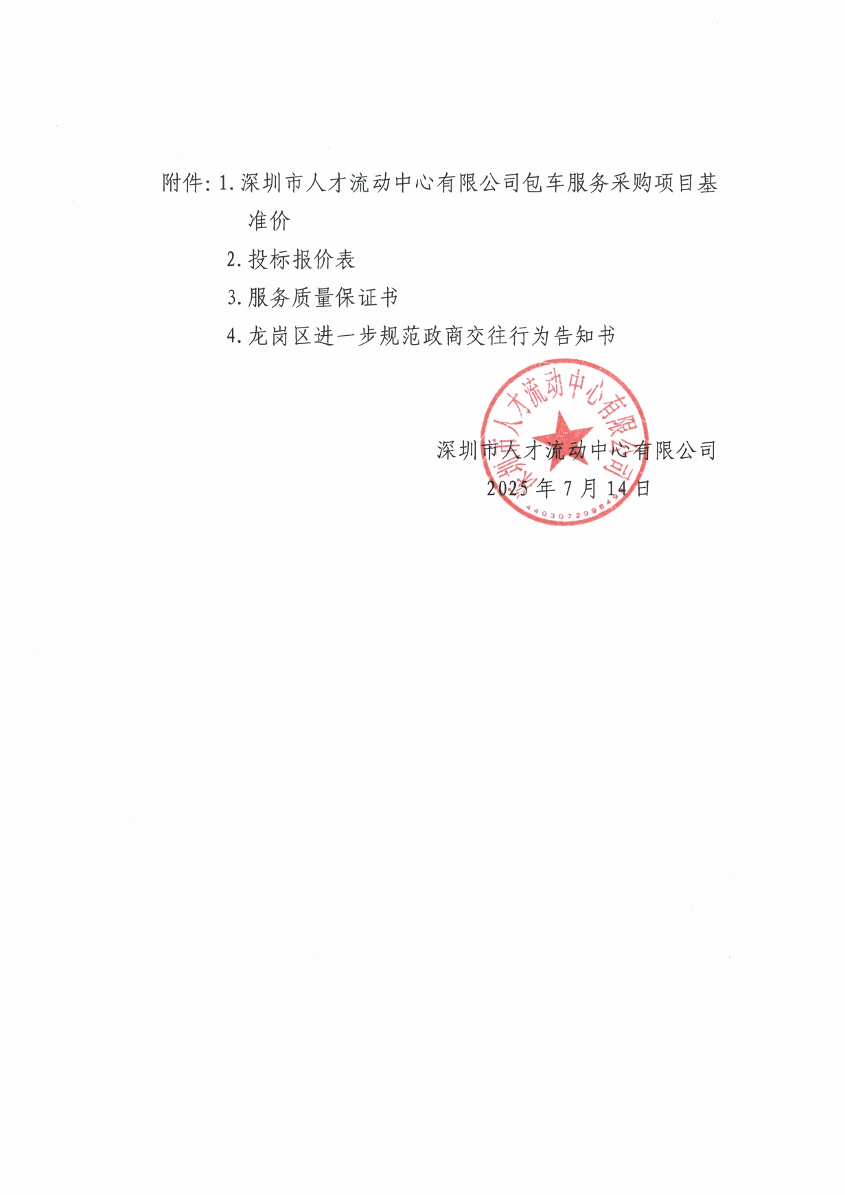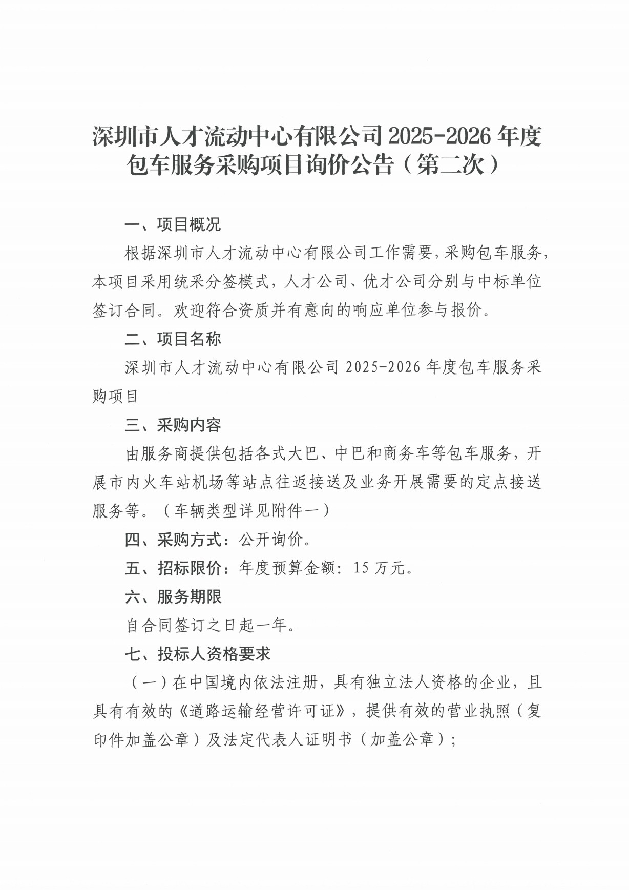 深圳市人才流动中心有限公司2025-2026年度包车服务采购项目询价公告(第二次)
